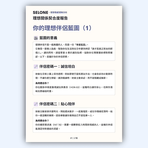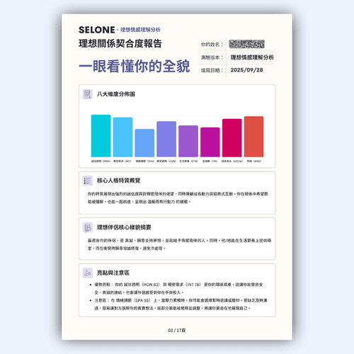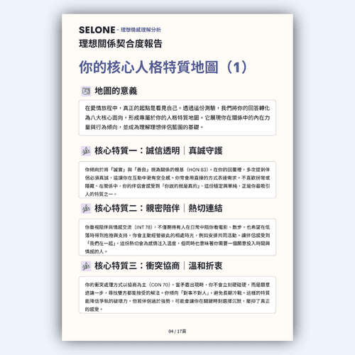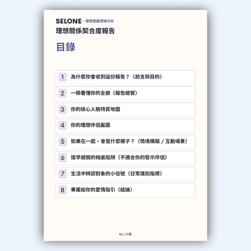 最終你將在 週1/週4 批次交付專屬報告。報告內容以八大模組呈現,用清晰的語言、邏輯與溫度,描繪出你在愛裡最真實的樣子,交給你一份真正能幫你看清盲點、找到出口的導航地圖。